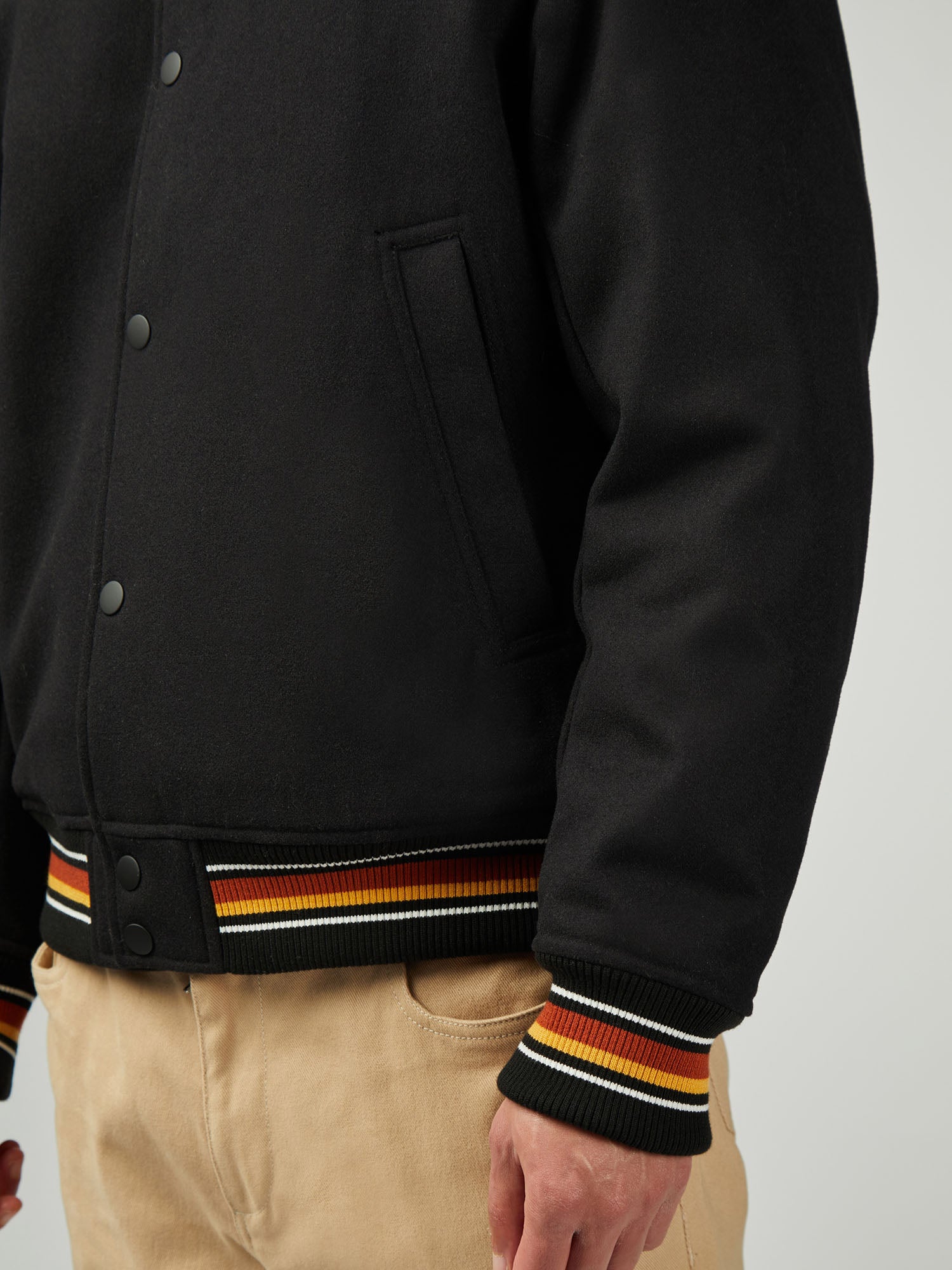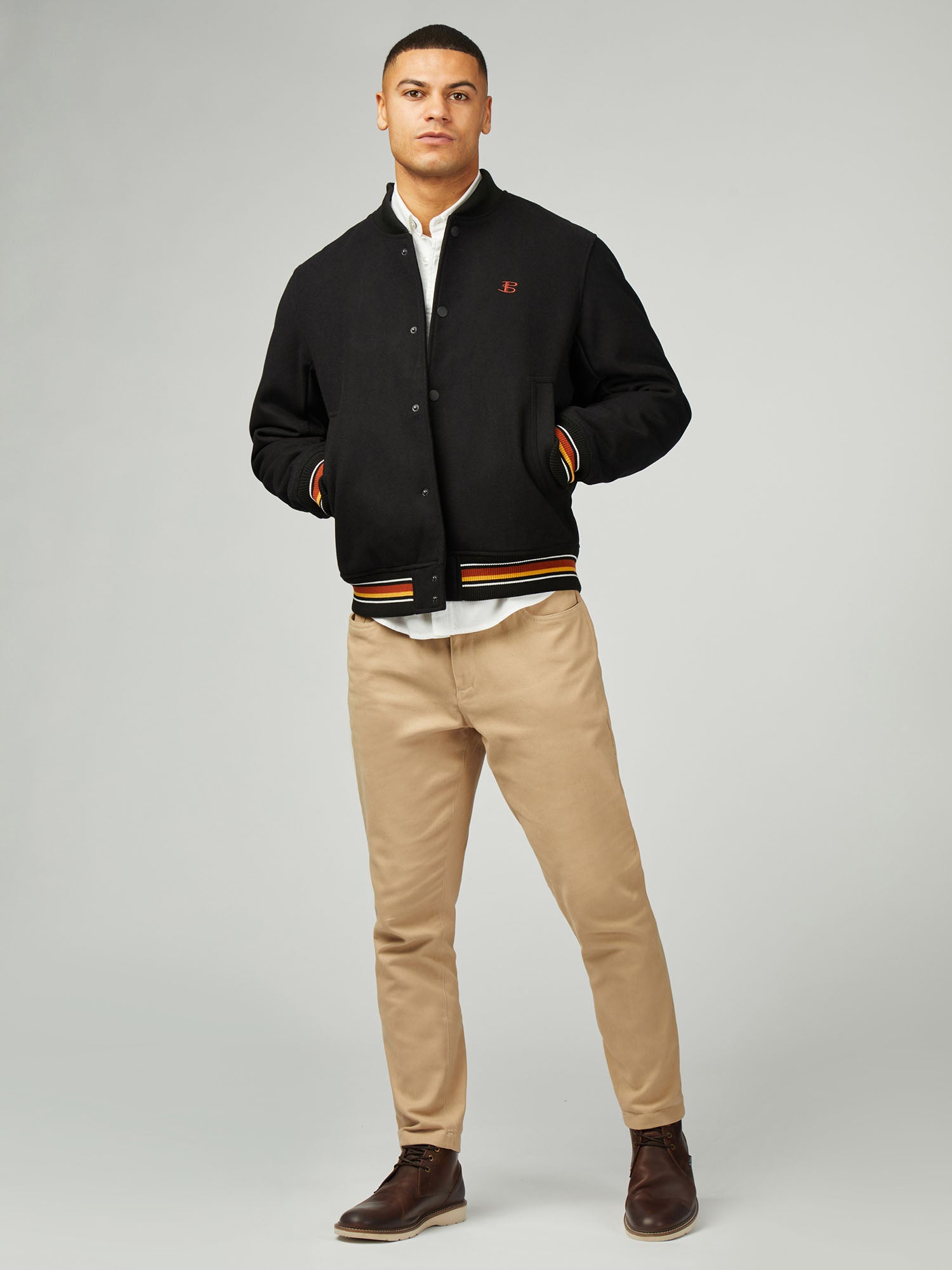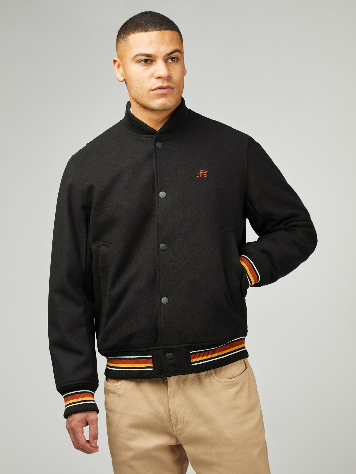 A wool blend jacket with two external  pockets and internal welt pocket. This style features, rubber coated snap buttons and stripe lining. As part of our 'B by Ben Sherman' range, this jacket is branded with a contrast B flag label.